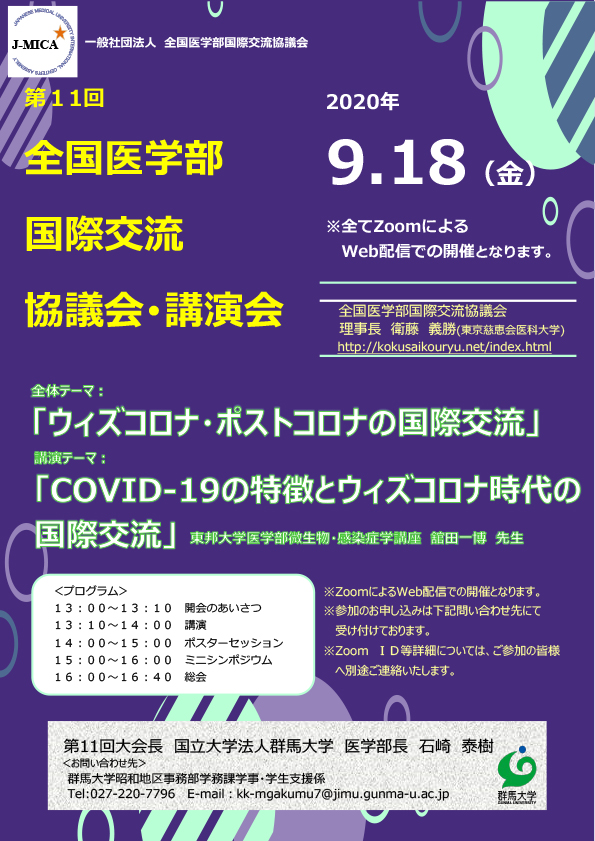 第11回全国医学部国際交流協議会・講演会は群馬大学医学部にて(石崎教授担当)、2020年9月18日(金)に開催されます。詳細は決まり次第、HPにアップさせて頂きます。